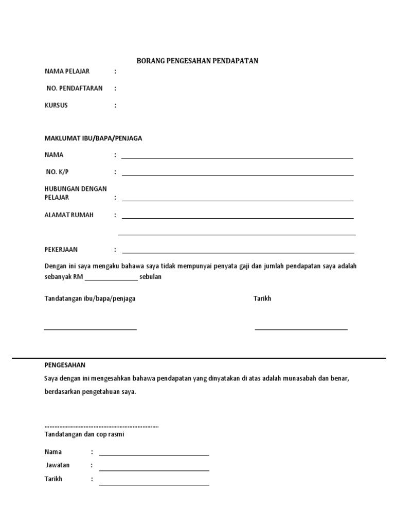 Borang Pengesahan Pendapatan Ibu Bapa